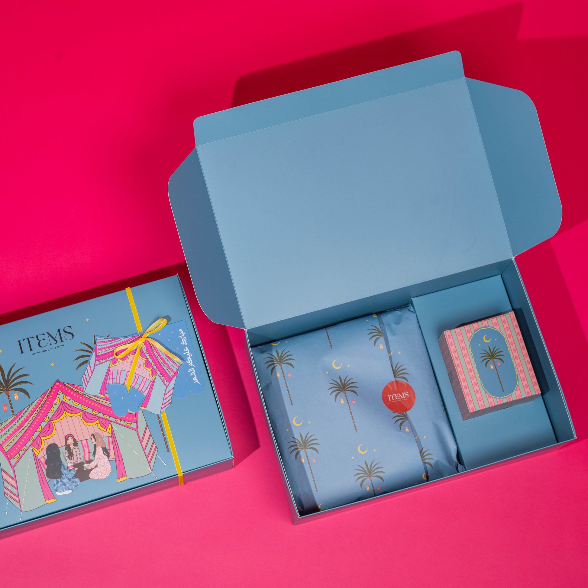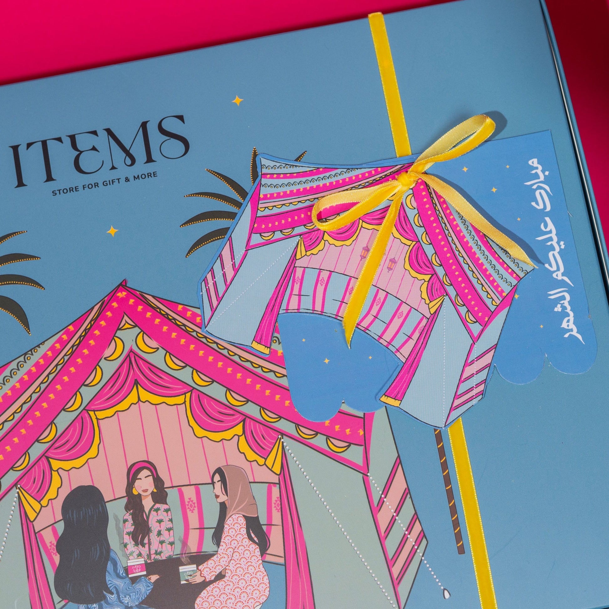 • 🎁 علبة هدايا بتصميم خيمة ايتمز مع كرت.